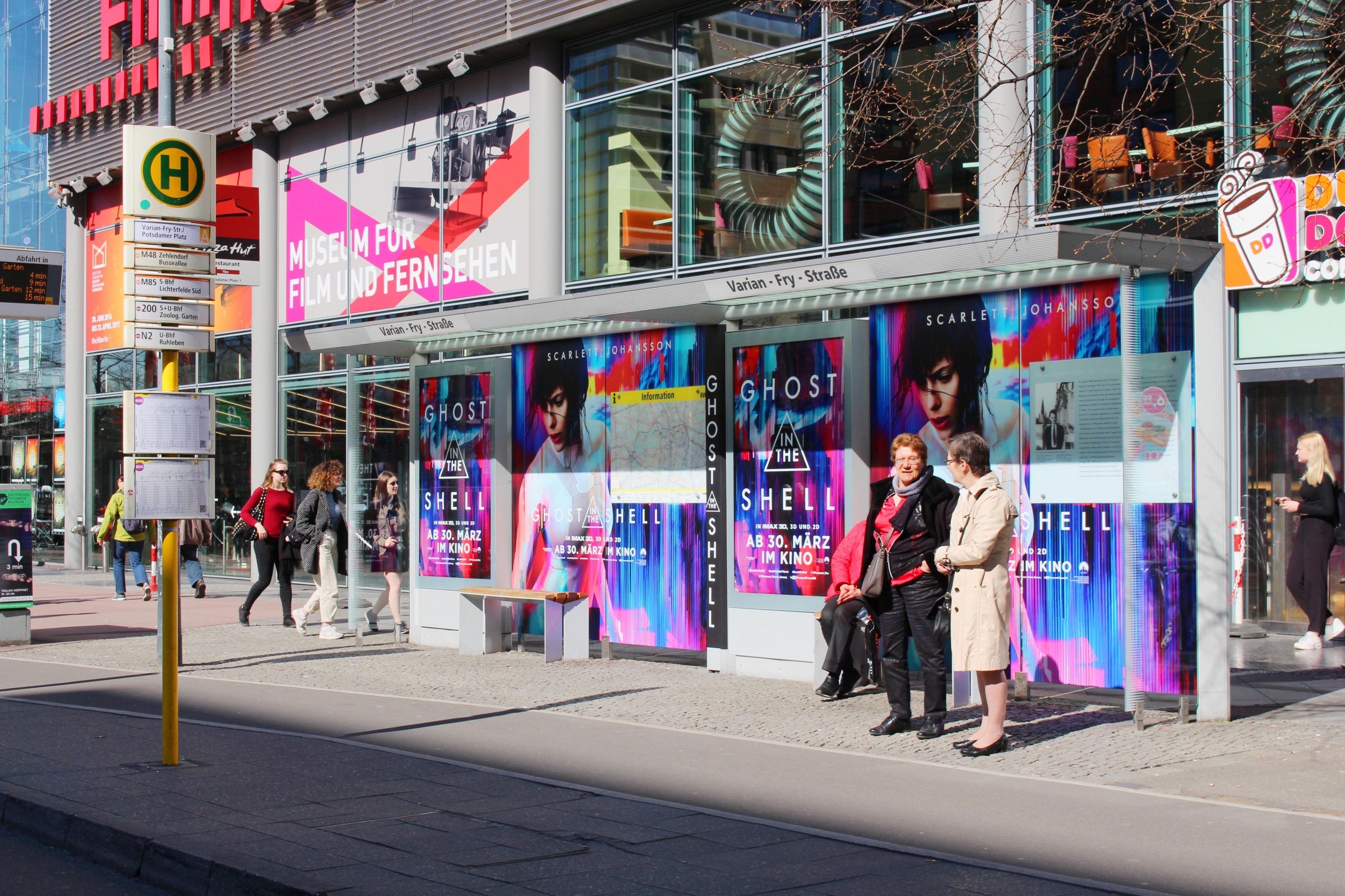 Aufmerksamkeitsstarkes Wartehallenbranding für den neuen Paramount Blockbuster Ghost in the Shell am Potsdamer Platz.