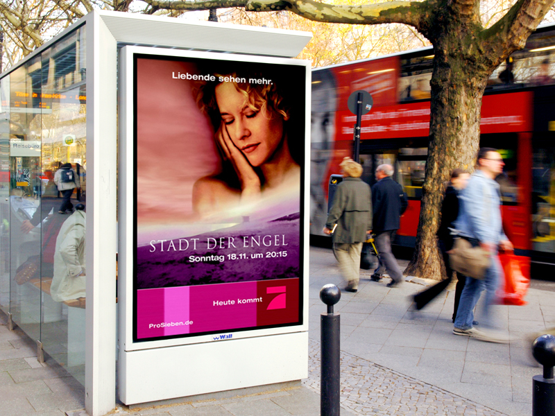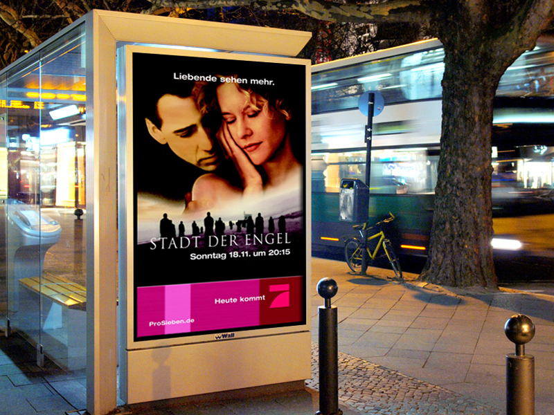 City Light Poster mit Tag-/Nacht-Effekt. Mit der Tageszeit veränderte sich das Motiv der Filmkampagne. In der Nacht erscheinen die Engel.