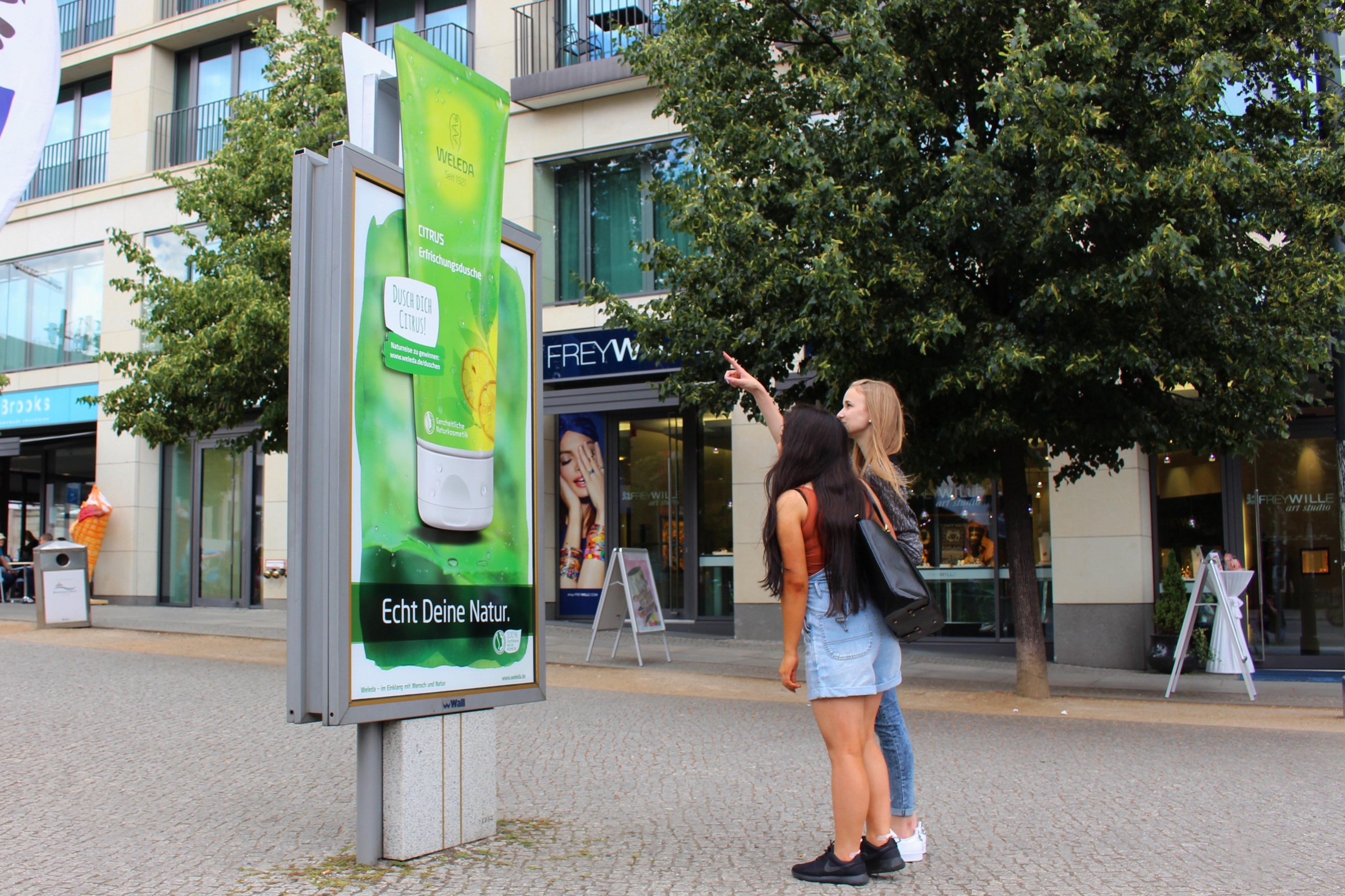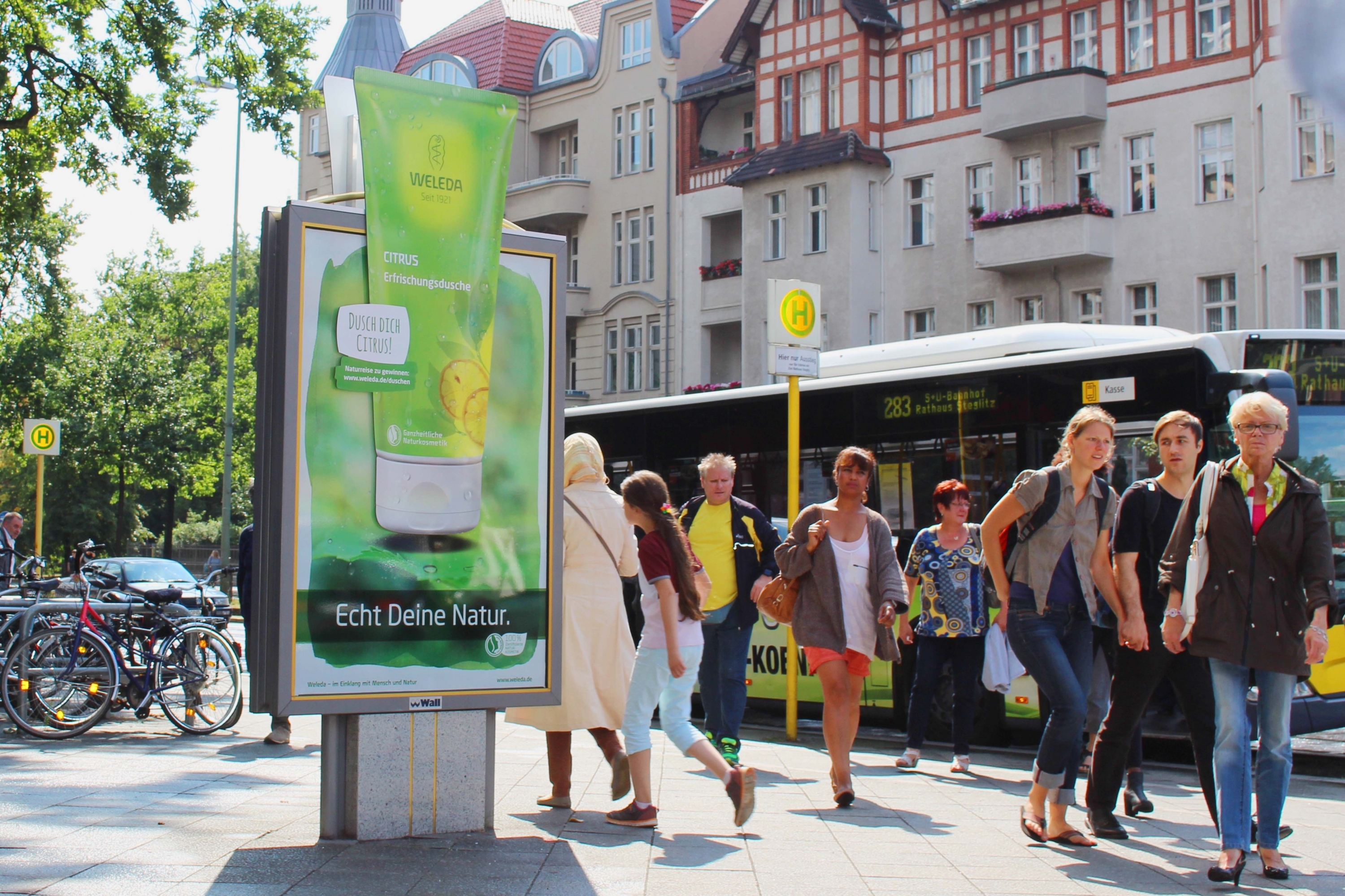 Eine Dekoration, die über das gewohnte Maß hinausgeht: Freistehende Stadtinformationsanlagen wurden mit übergroßen Tuben für den Kunden Weleda in Berlin aufmerksamkeitsstark dekoriert.