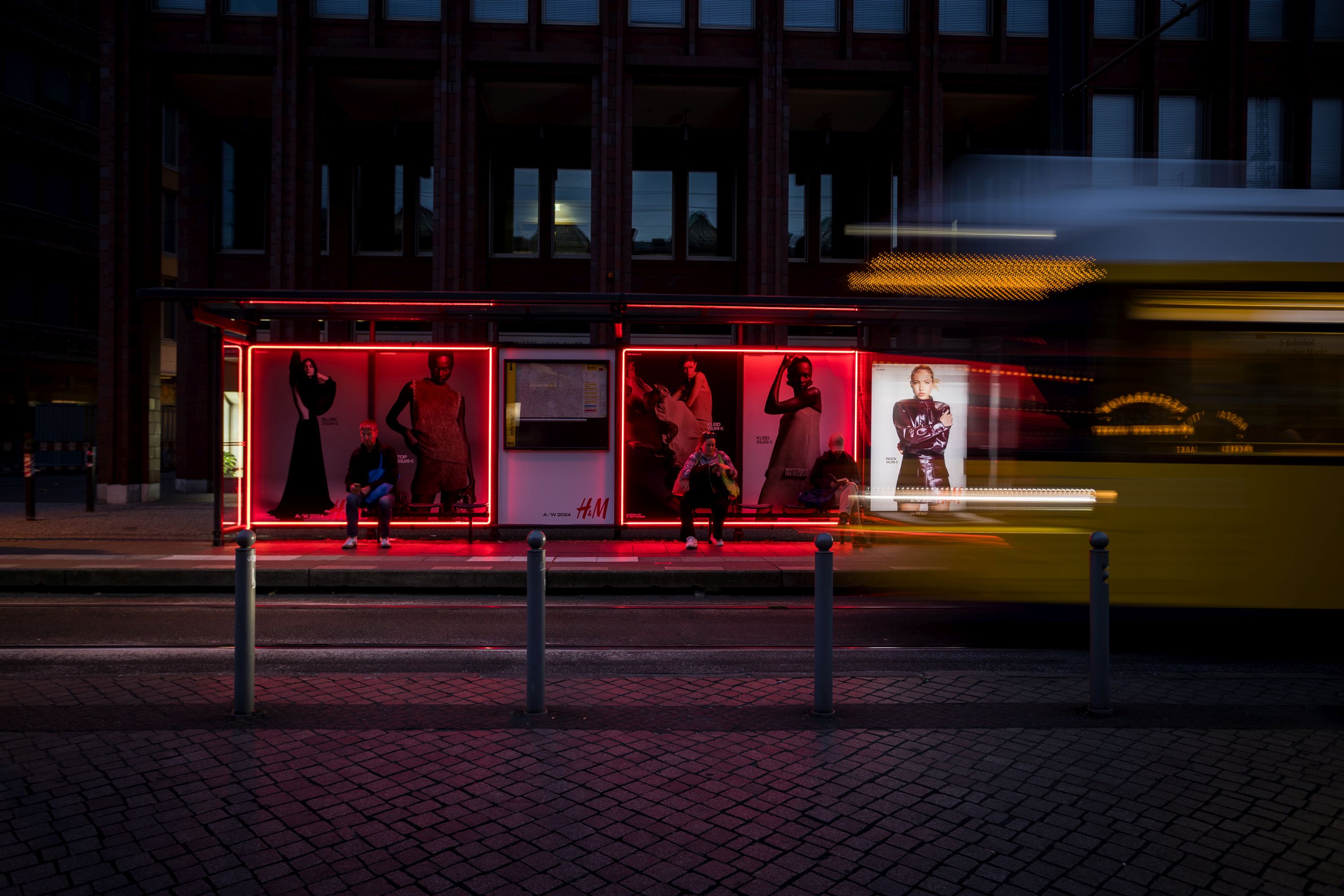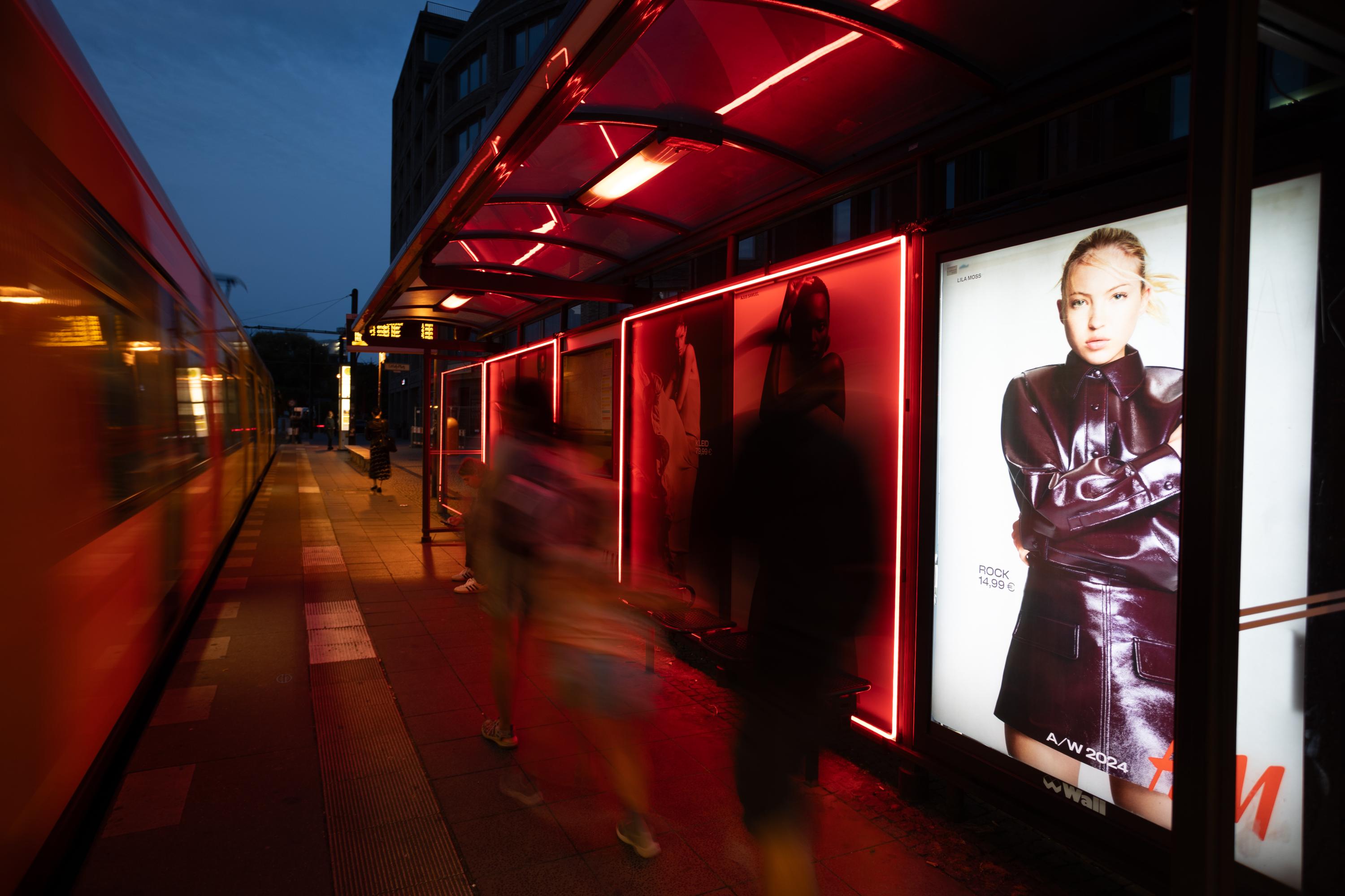 Die Berliner Nacht erstrahlte im Licht der Wartehallenumsetzung von H&M. Das leuchtende H&M-Rot sowie die modischen Plakate waren ein absoluter Hotspot für alle wartenden Modebegeisterten.