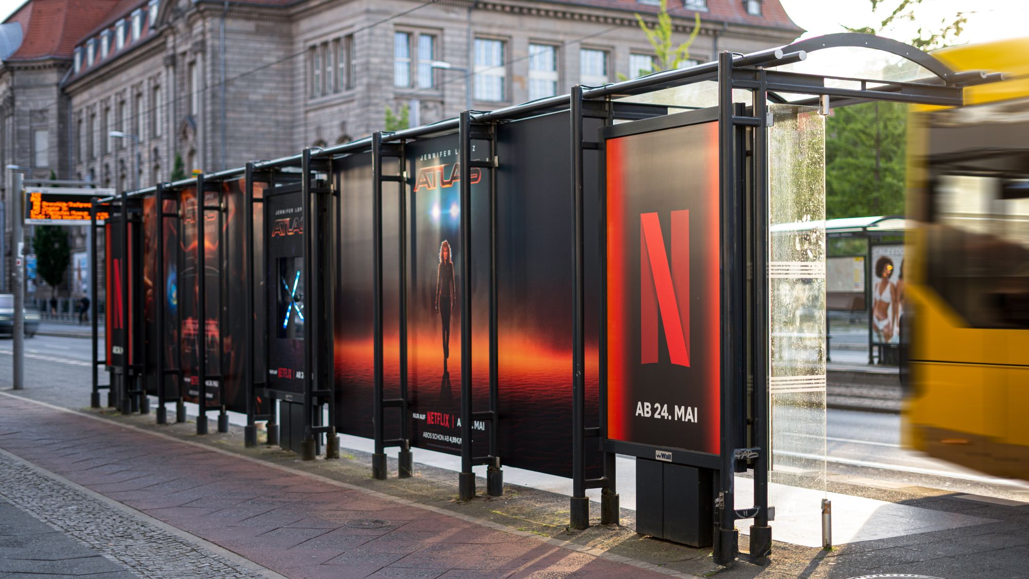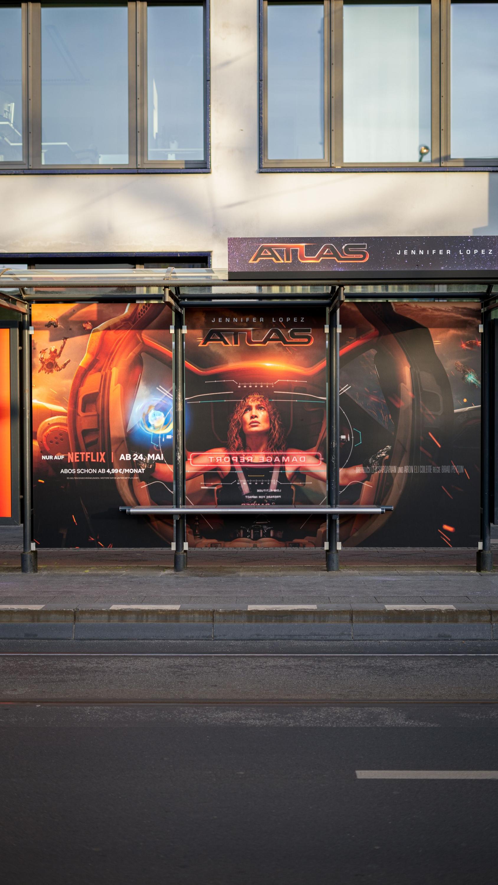 Beim Wartehallenbranding für den Netflix Film "Atlas" in Berlin wurden Floor Graphics und beleuchtete Dachblenden eingesetzt. Ein besonderes Highlight war jedoch der Holocircle.