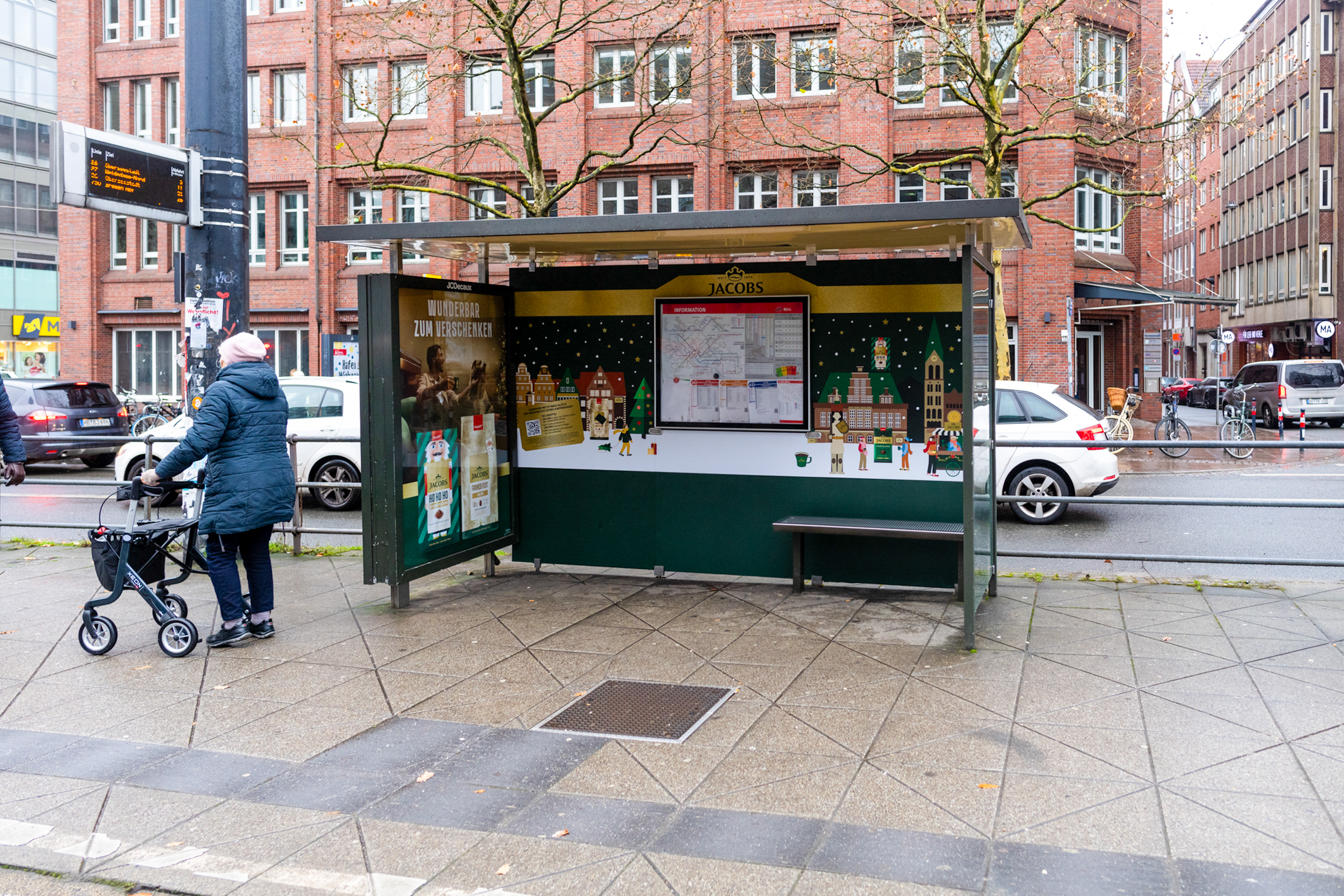 Mit Jacobs wurde die Bremer Innenstadt in der Vorweihnachtszeit zum echten Hingucker: An fünf Standorten hüllte ein Branding die Wartehallen in einen festlichen Look und versetzte die Passanten in weihnachtliche Stimmung.