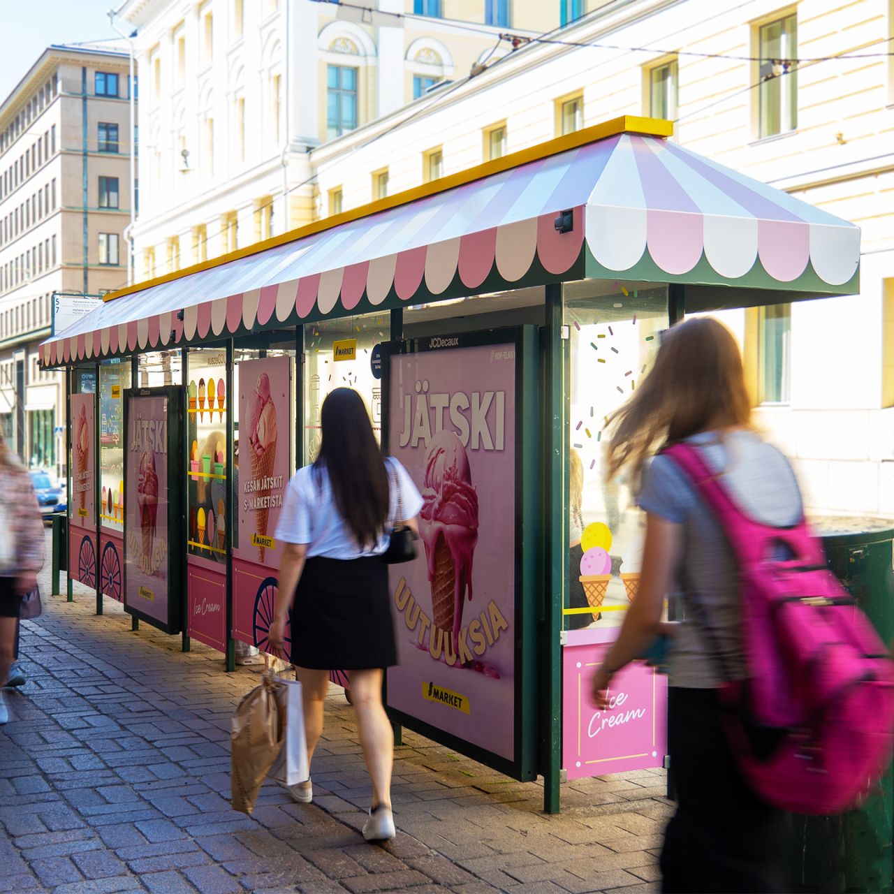 Das Wartehallenbranding für S-Market in Helsinki verwandelte die Haltestelle optisch in einen beeindruckenden Eiskaffee-Kiosk. Diese kreative Maßnahme brachte sommerliche Freude in die Stadt und bot den Passanten ein erfrischendes und außergewöhnliches Erlebnis.