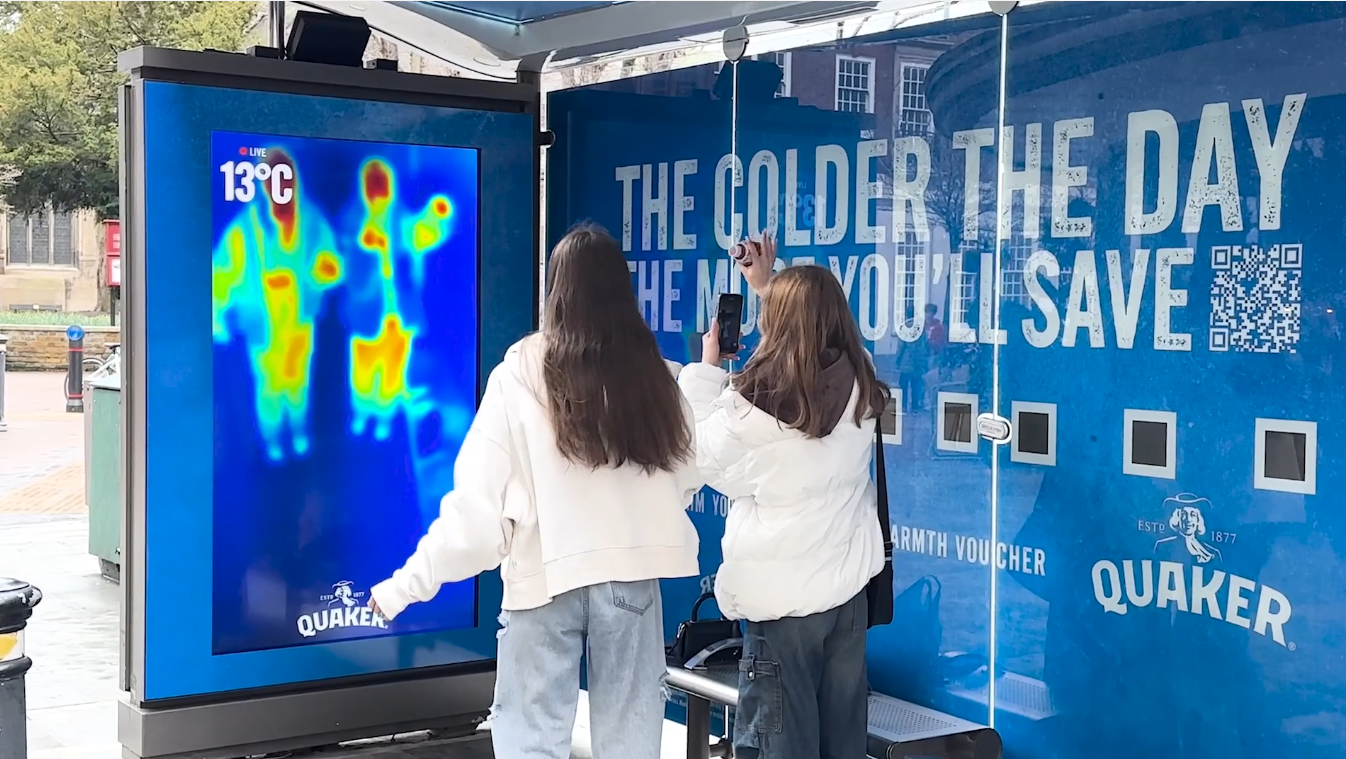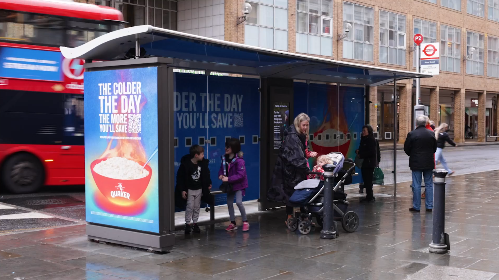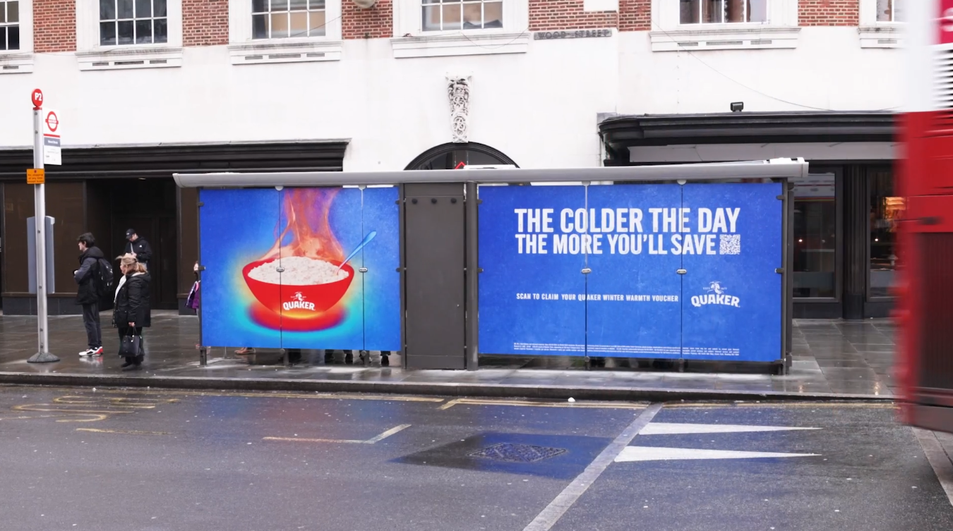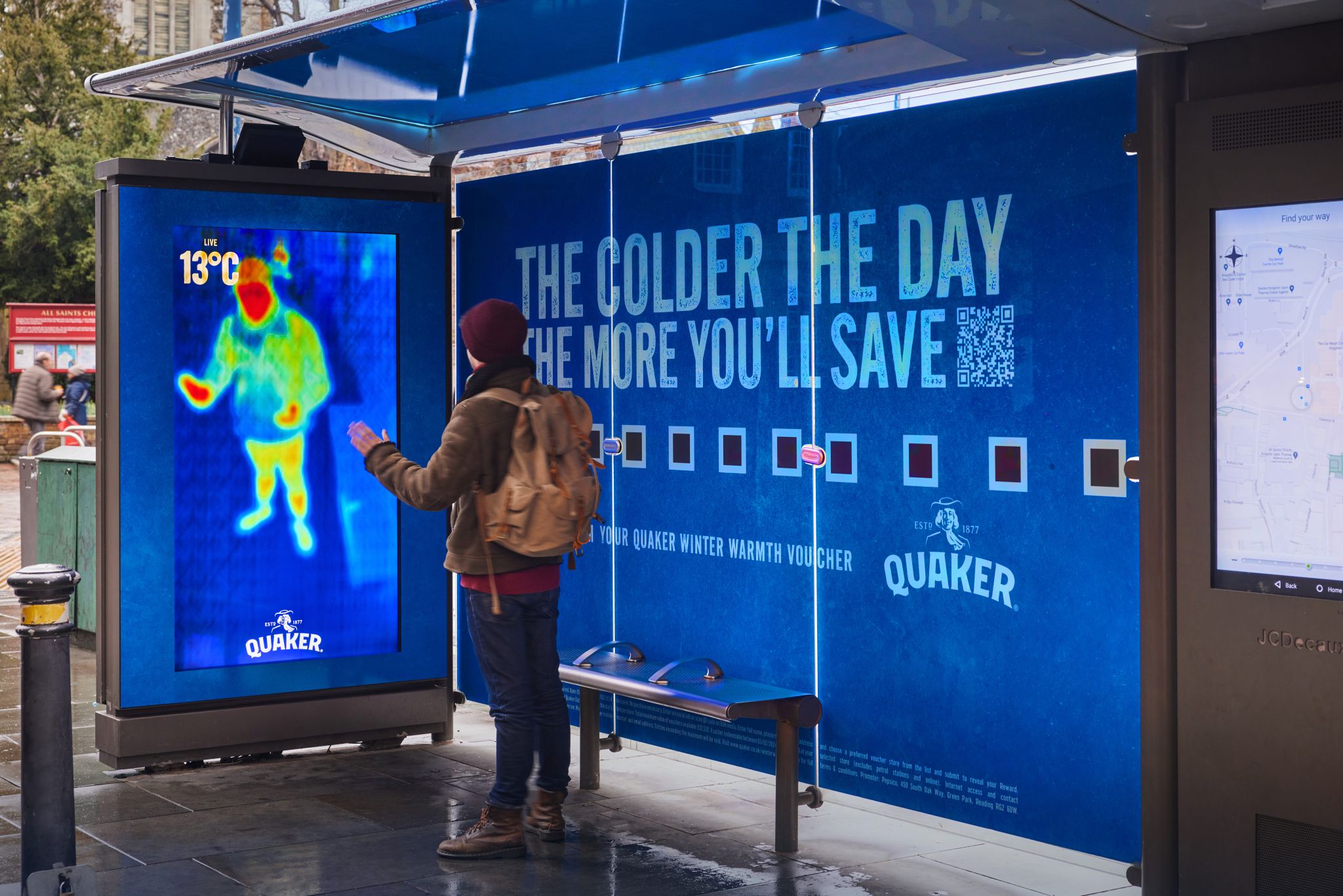 Das Wartehallenbranding für Quaker Oats verbreitete im Winter Wärme in Kingston. Genutzt wurde ein LIVE-Thermobild-Feed, der die Wartenden ermutigte, einen Quaker-Winter-Warmth-Voucher zu beanspruchen. Je kälter der Tag war, desto mehr konnte man sparen.