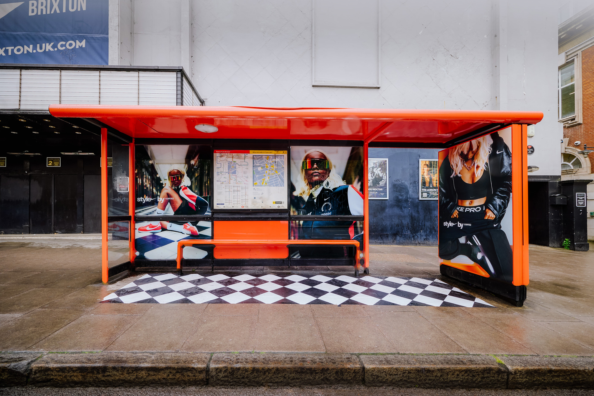 In der Sommerkampagne „Style by Cortez“ von Nike wurden Wartehallen-Brandings in Brixton und Dalston, London, umgesetzt. Inspiriert von den lebhaften Farben und dynamischen Grafiken aus Los Angeles, erwecken hochglänzendes Vinyl und elegante Schachbrettboden-Grafiken die Kampagne zum Leben.