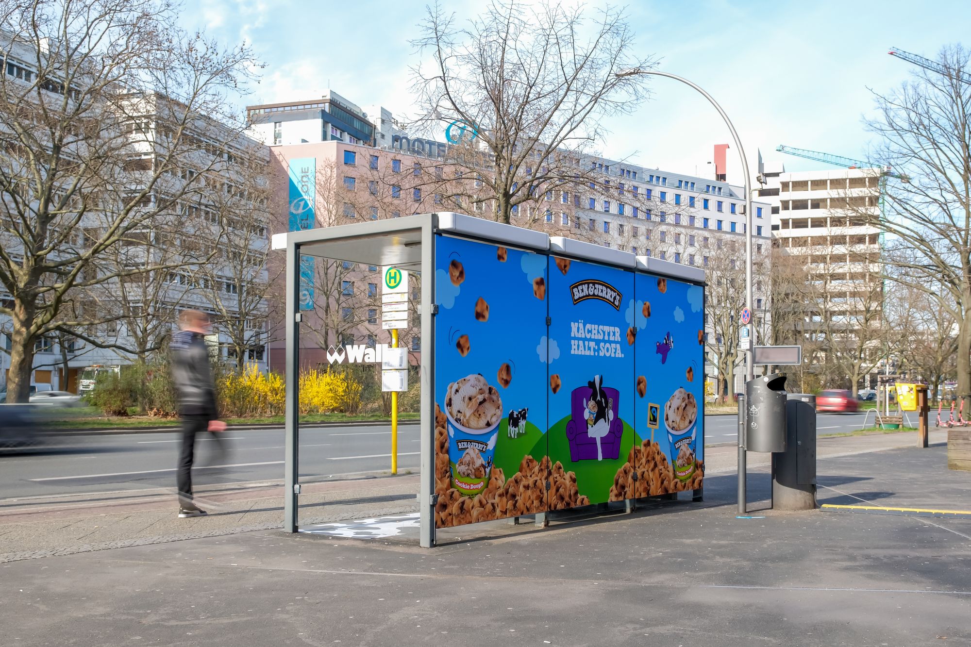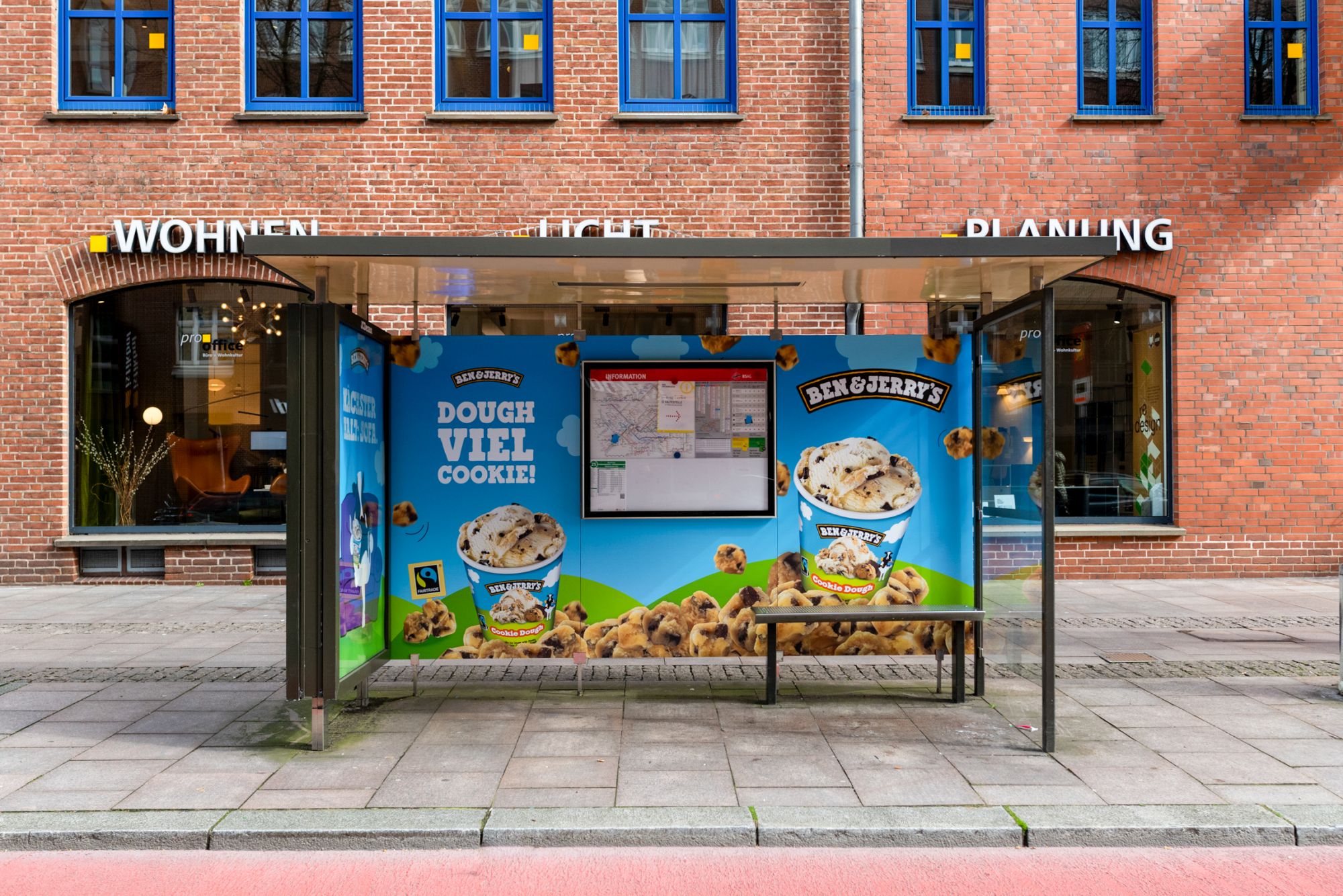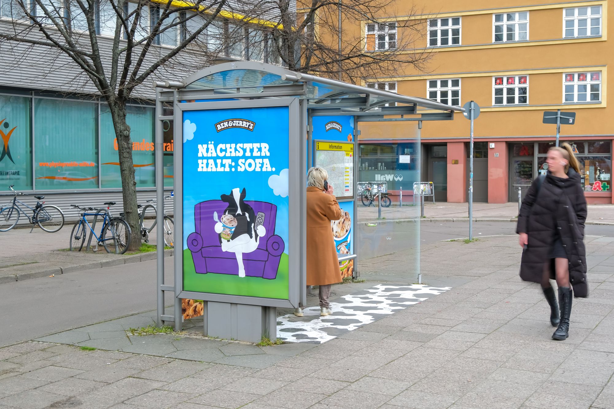 Die neue Kampagne für Ben and Jerry's Eiscreme in der Geschmacksrichtung Cookie Dough. Motiv und Kuhflecken Floor Branding sorgten in Berlin, Bremen und Düsseldorf für Aufmerksamkeit.